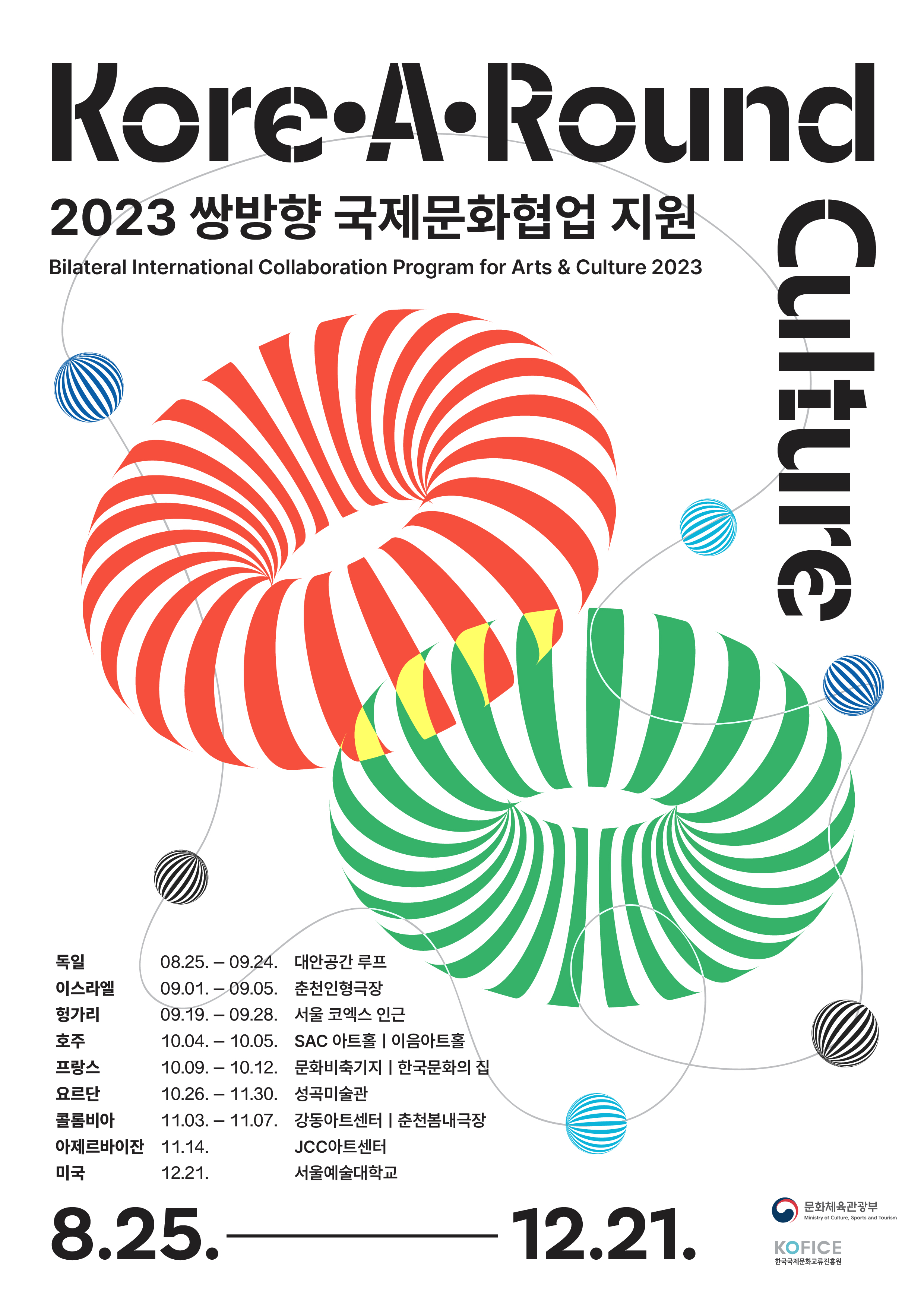 문체부는 K-컬처의 전 세계적 인기와 더불어 한국 문화예술인과 협업하고 싶어하는 해외의 수요가 증가하는데 발맞춰, 해외 문화예술인의 국내 활동과 국내 문화예술인과의 협업을 지원하고, 우리 문화예술인이 다시 해외에 진출할 수 있는 선순환 환경을 구축하고자 ‘코리아라운드 컬처’ 사업을 올해 새롭게 진행한다. 첫 협업 국가로 독일과 이스라엘, 헝가리, 호주, 프랑스, 요르단, 콜롬비아, 아제르바이잔, 미국 등 총 9개국을 선정해 전시와 공연 등 다양한 분야에서 한국 문화예술인과의 협업을 선보일 계획이다.