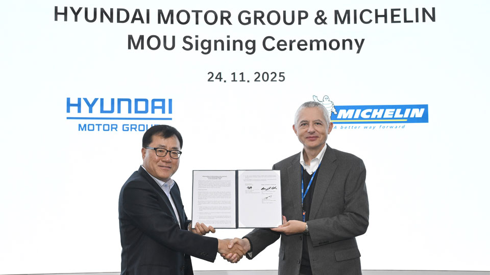 현대자동차·기아는 24일(월) 남양연구소에서 현대자동차·기아 제네시스설계센터장 신용석 상무, 미쉐린 조지레비(Georges Levy) 아시아퍼시픽 OE 총괄 부사장 등이 참석한 가운데 기술 공동개발 업무협약식을 갖고, 차세대 모빌리티를 위한 타이어 기술 리더십 확보에 나선다고 밝혔다.